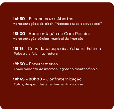 A imersão acontece das 9h às 20h, com pausas para descanso e alimentação. É um mergulho de um dia inteiro dedicado à prática, troca e expressão.